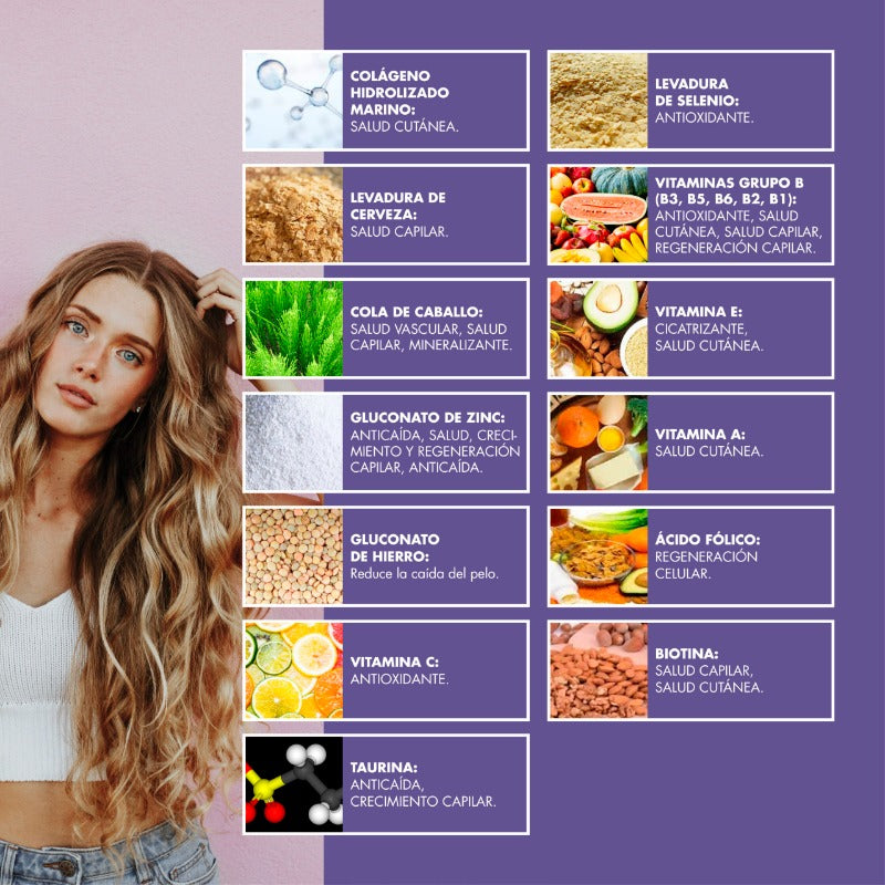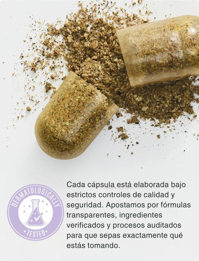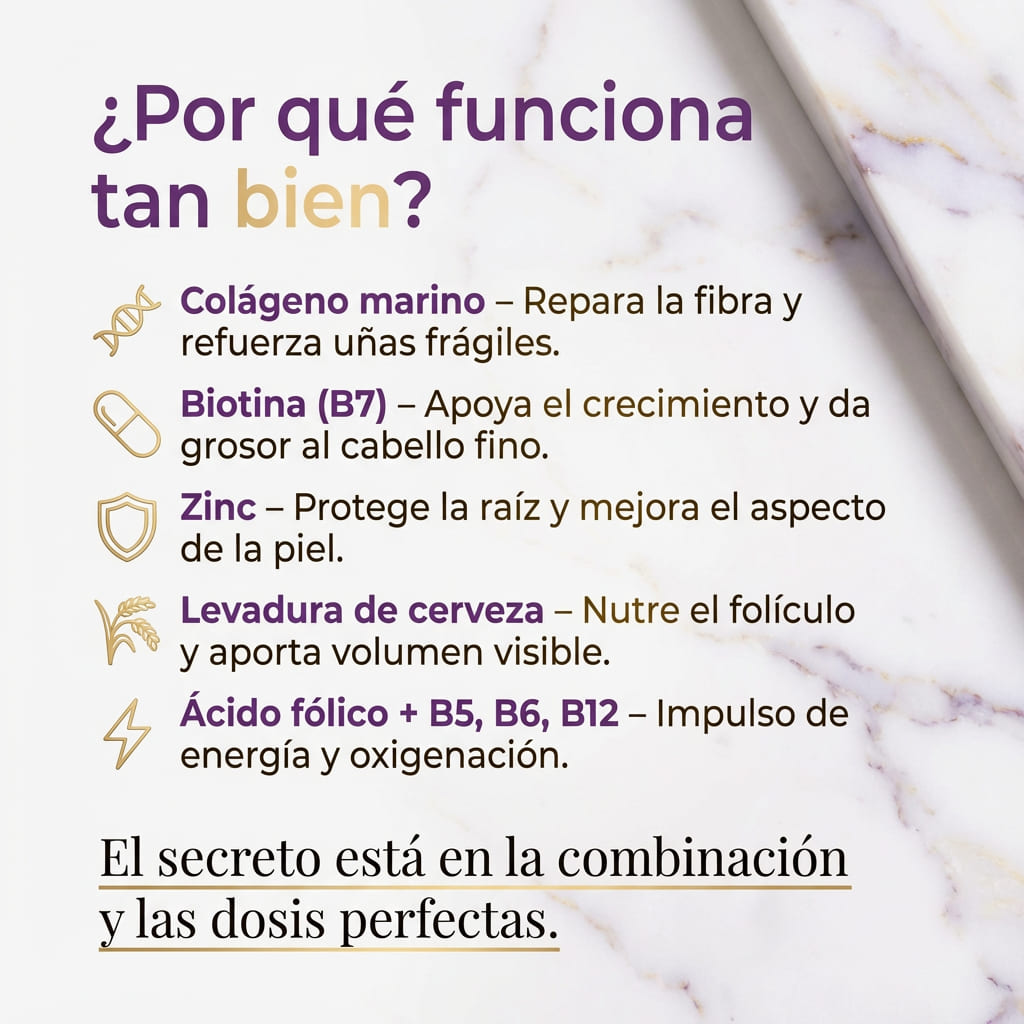 Nuestra matriz patentada con Biotina 5000 mcg y Ácido Hialurónico actúa desde el interior para un cambio estructural visible y duradero.